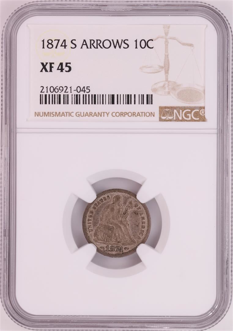 One 1874-S Seated Liberty Dime Coin NGC XF45. NGC Certified.