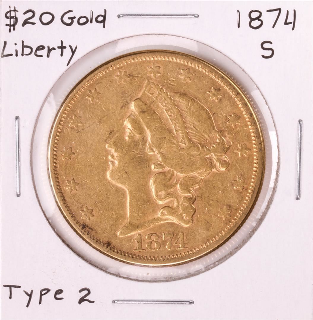One 1874-S Type 2 $20 Liberty Head Double Eagle Gold Coin.