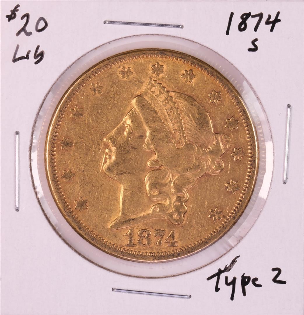 One 1874-S Type 2 $20 Liberty Head Double Eagle Gold Coin.
