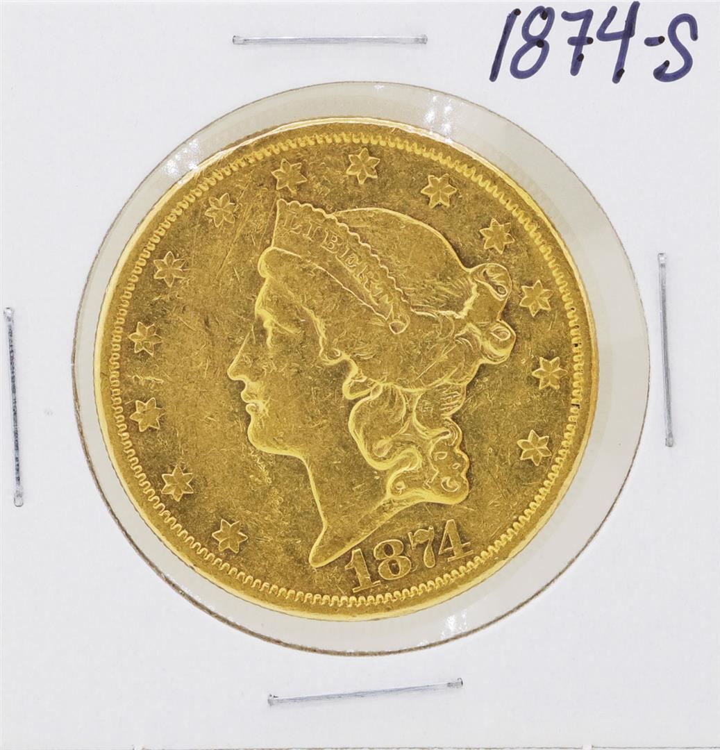 One 1874-S Type II $20 Liberty Head Double Eagle Gold Coin.