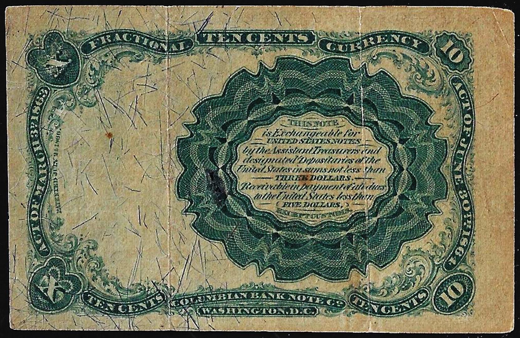 One 1874 Ten Cent Fifth Issue Fractional Currency Note.