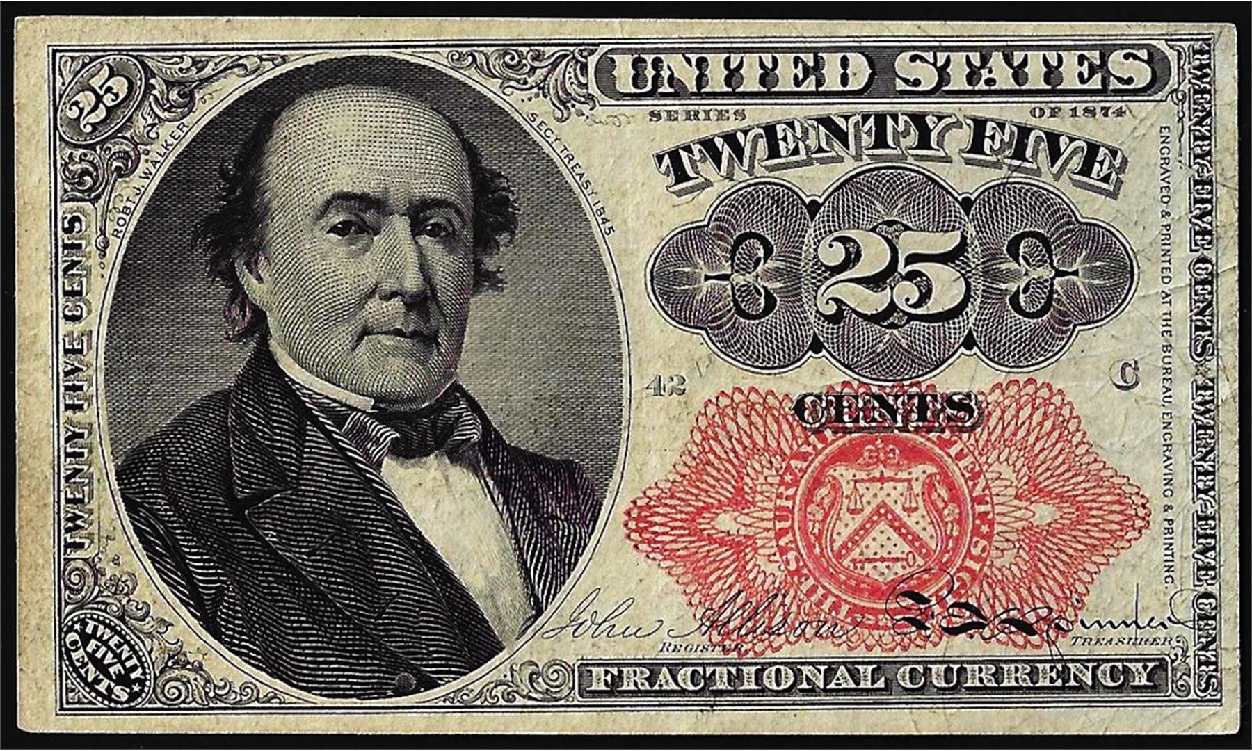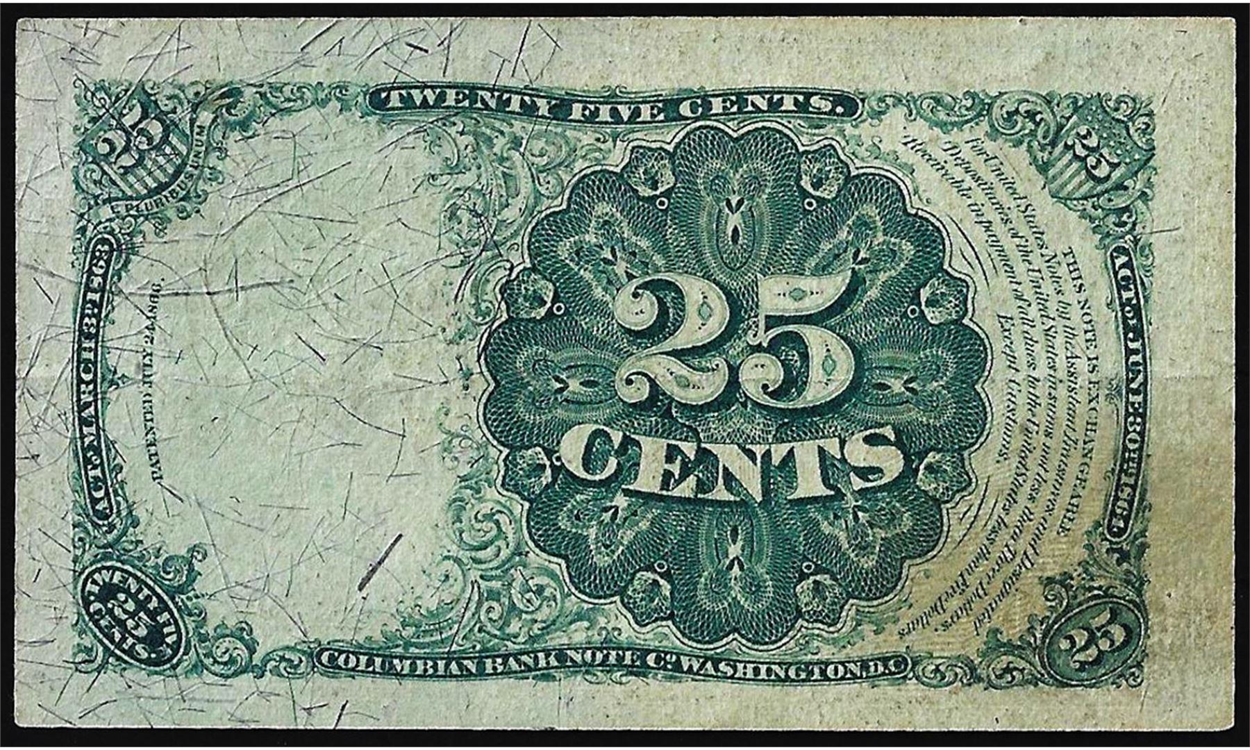 One 1874 Twenty-Five Cent Fifth Issue Fractional Currency Note.