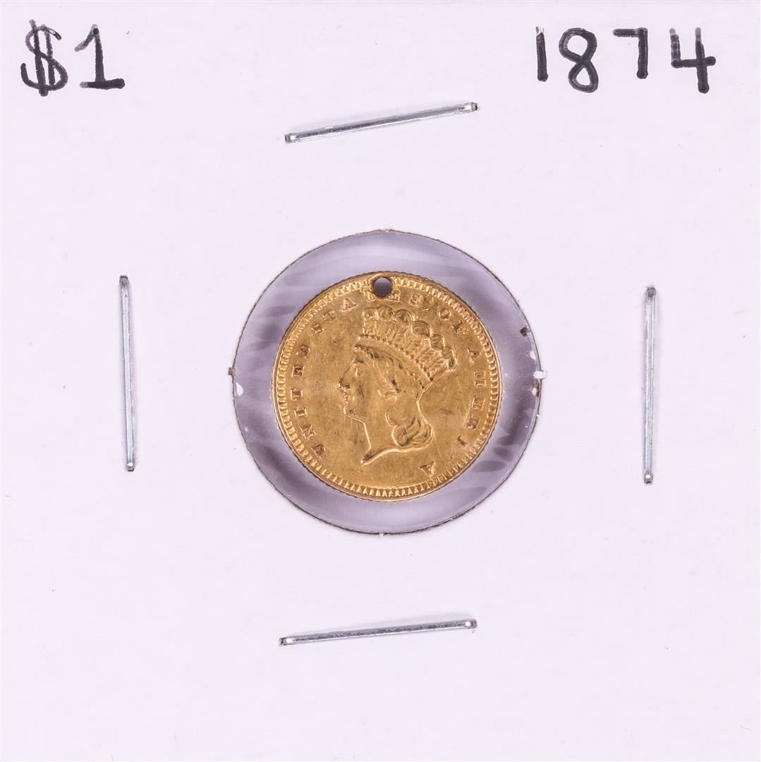 One 1874 Type 3 $1 Indian Princess Head Gold Dollar Coin with Hole.