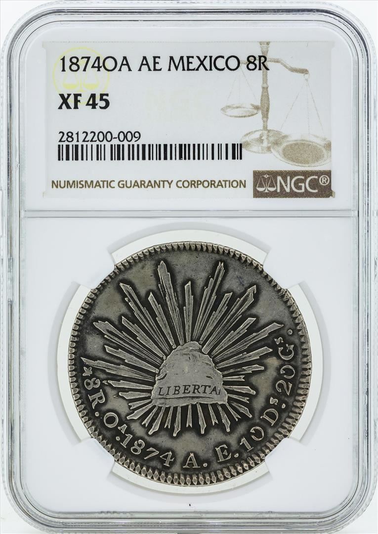 One 1874OA AE Mexico 8 Reales Coin NGC XF45. NGC Certified.
