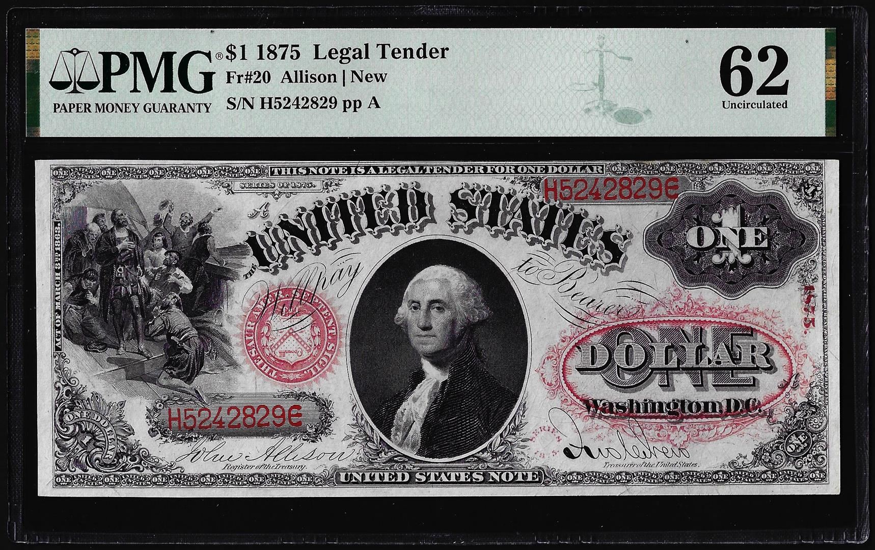 One 1875 $1 Legal Tender Note Fr.20 PMG Uncirculated 62. PMG Certified.