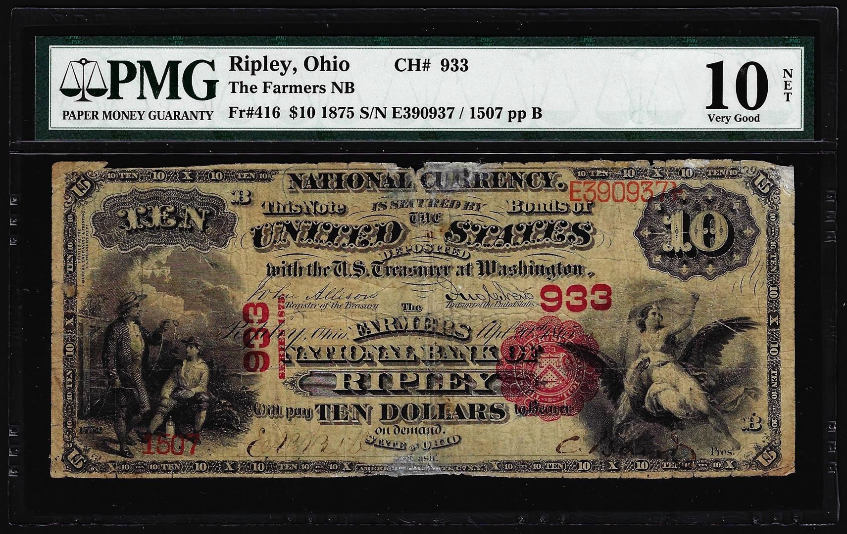 1875 $10 Farmers NB Ripley, Ohio Ch# 933 National Currency Note PMG Very Good 10 Net