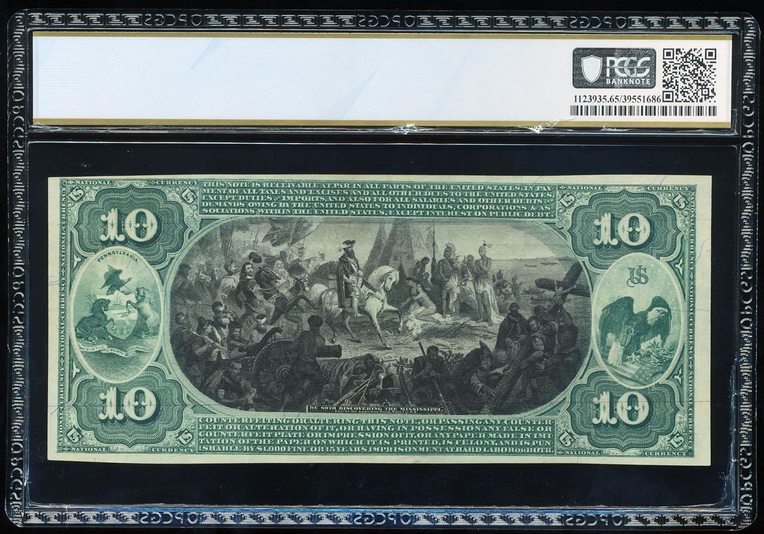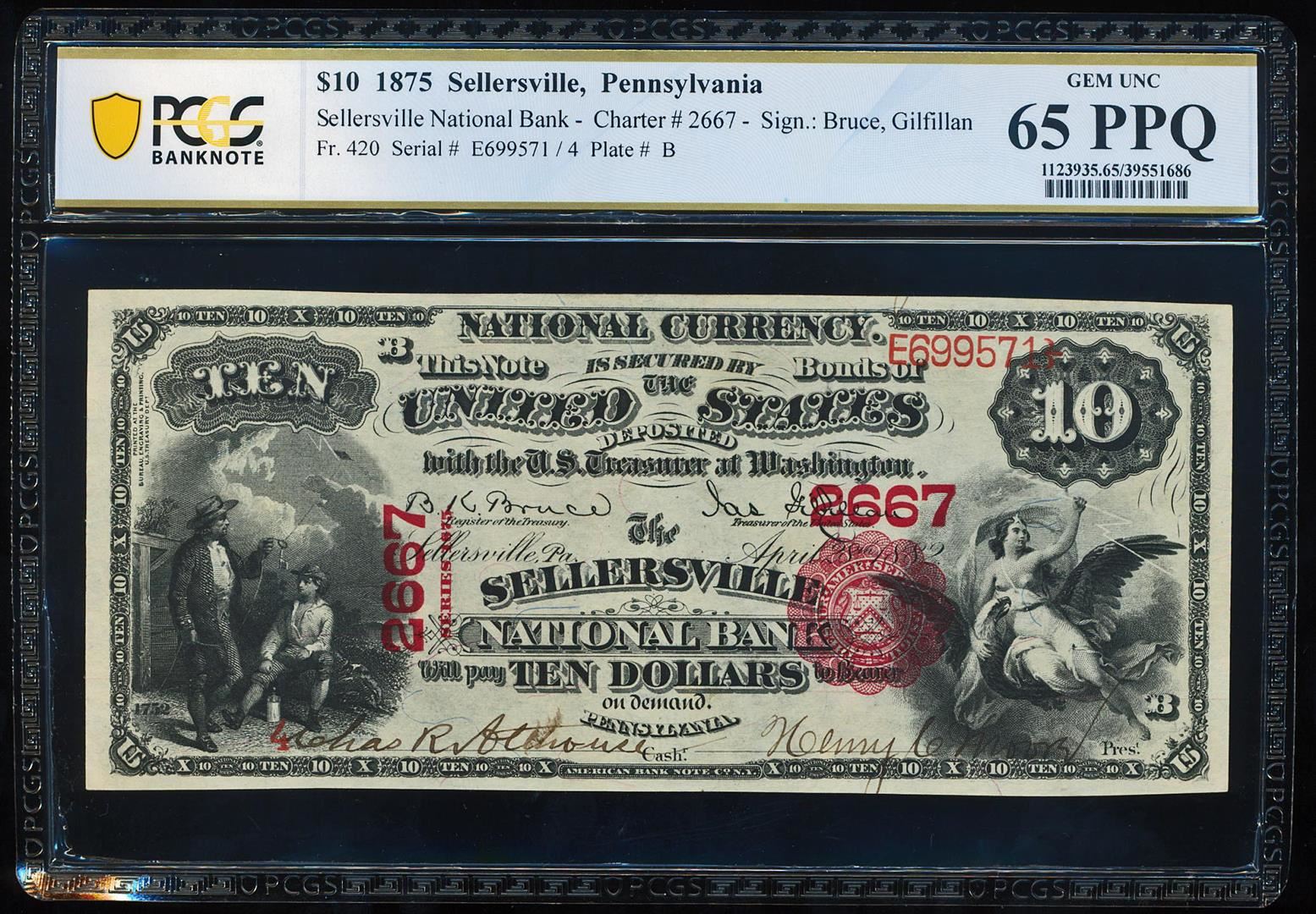 One 1875 $10 Sellersville, PA CH#2667 National Currency Note PCGS Gem Uncirculated 65PPQ. PCGS Graded.