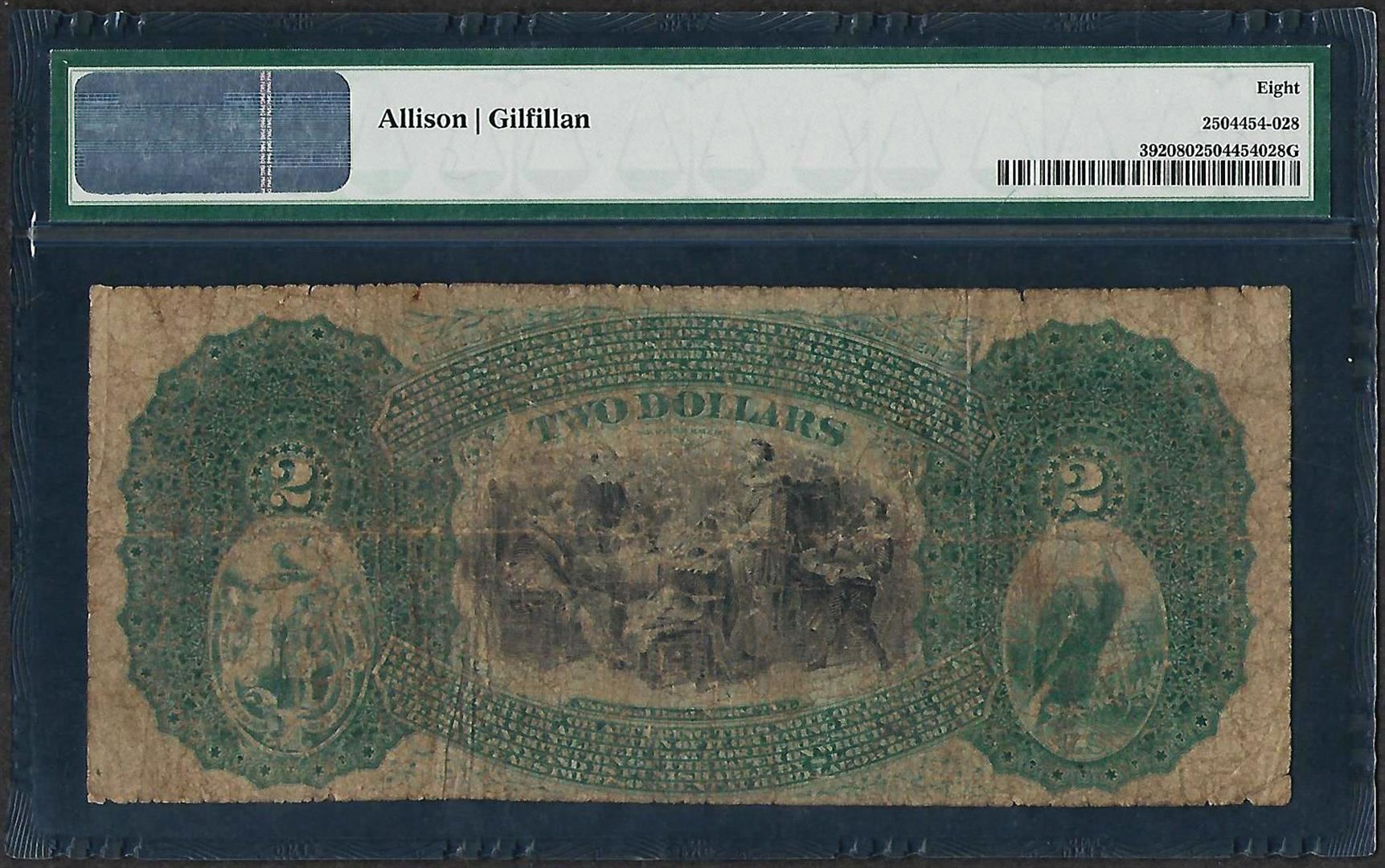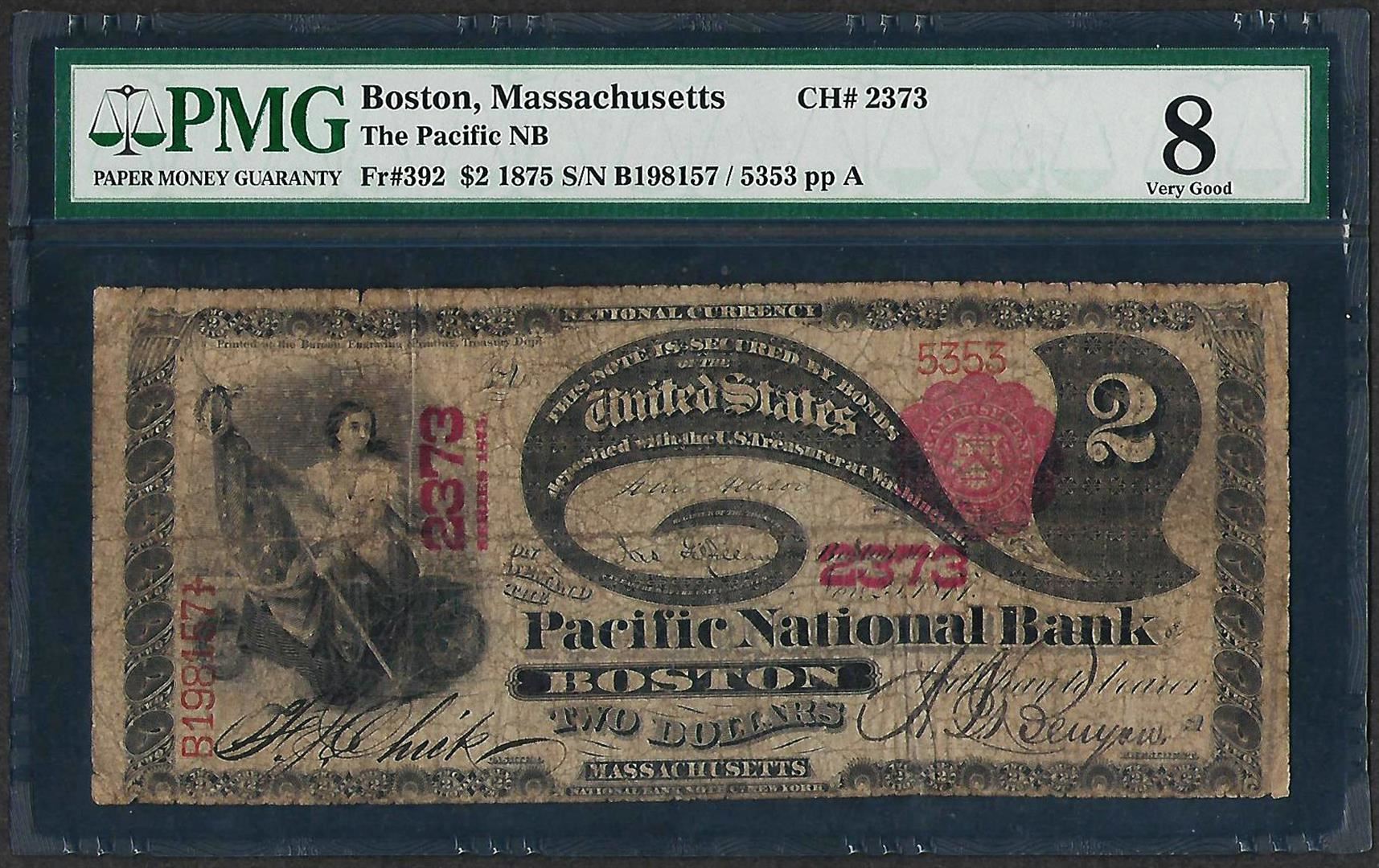 One 1875 $2 Lazy Deuce Pacific NB Boston, MA CH# 2373 National Currency Note PMG Very Good 8. PMG Certified.