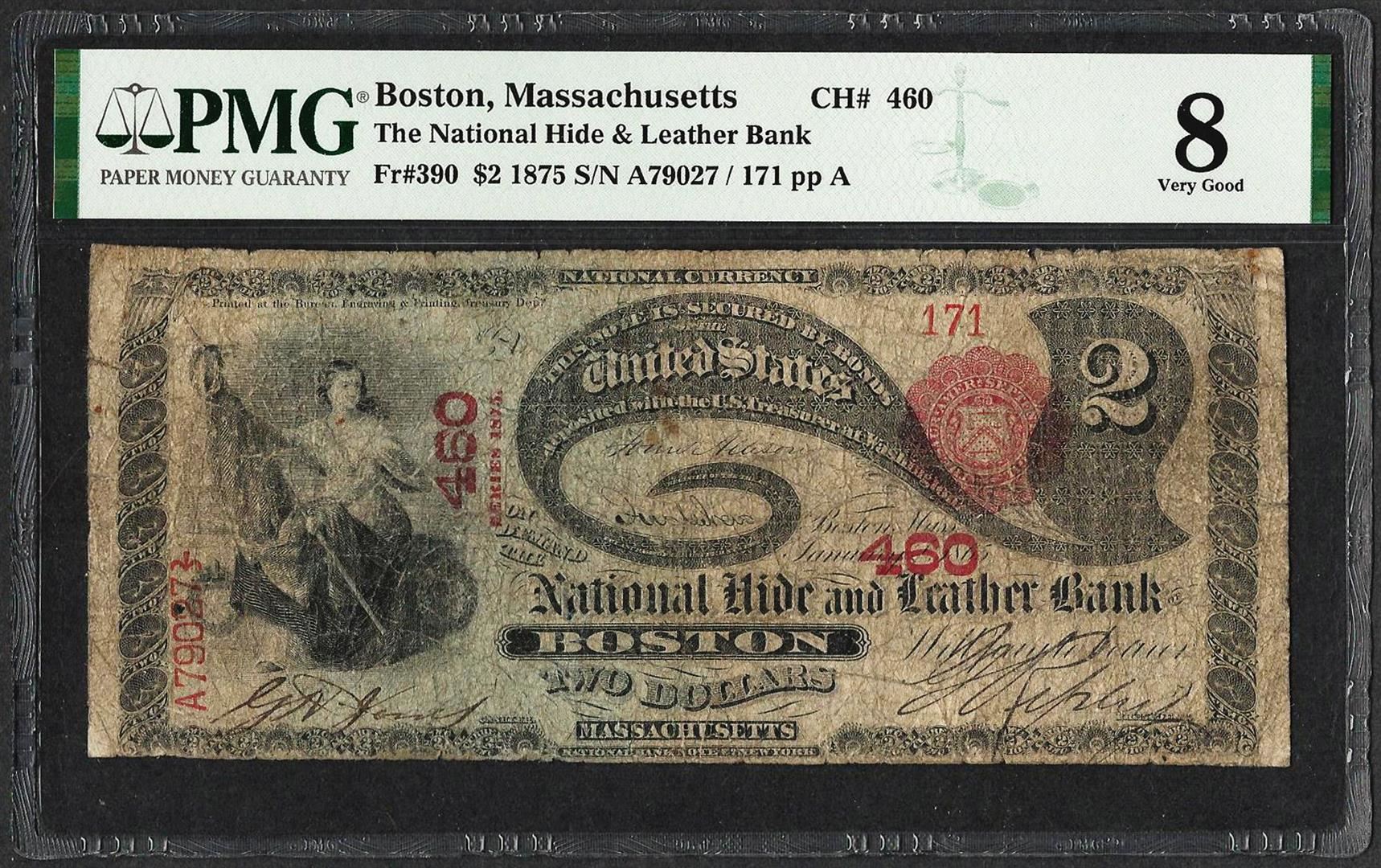 One 1875 $2 Lazy Deuce Pacific NB Boston, MA CH# 460 National Currency Note PMG Very Good 8. PMG Certified.