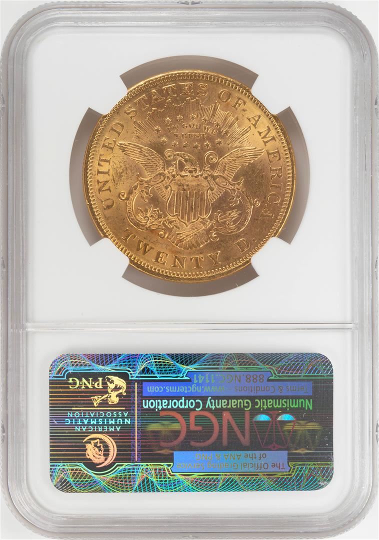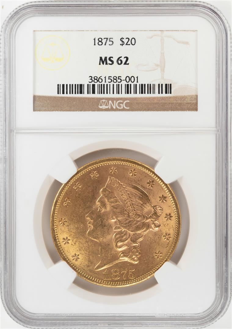 One 1875 $20 Liberty Head Double Eagle Gold Coin NGC MS62. NGC Certified.