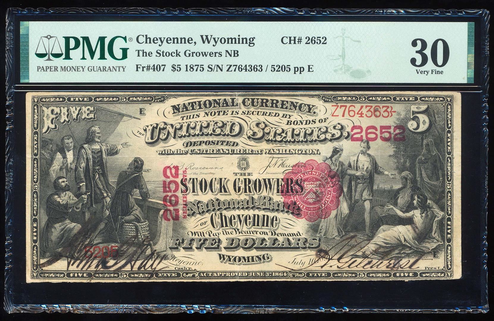 One 1875 $5 First Charter Cheyenne, WY CH# 2652 National Currency Note PMG Very Fine 30> PMG Certified.
