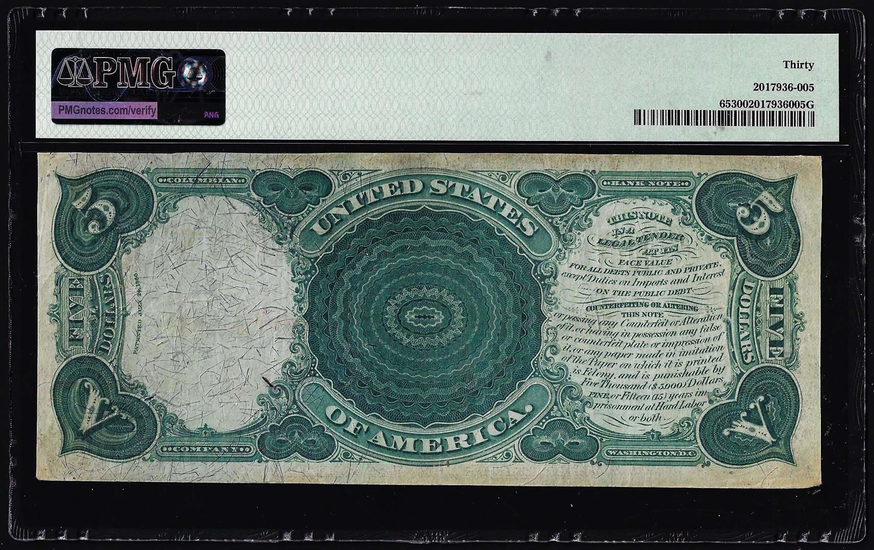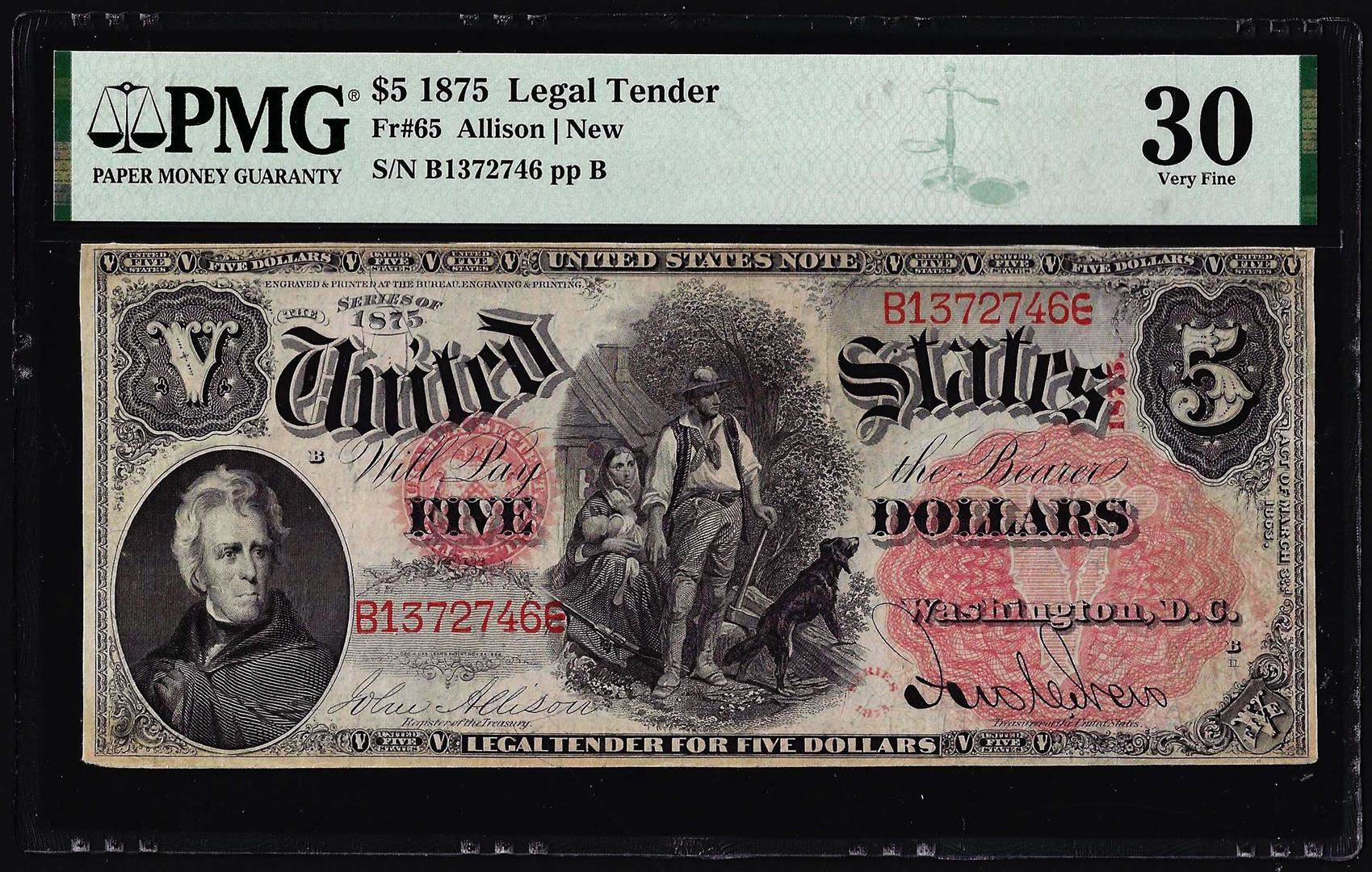 One 1875 $5 Woodchopper Legal Tender Note Fr.65 PMG Very Fine 30. PMG Certified.