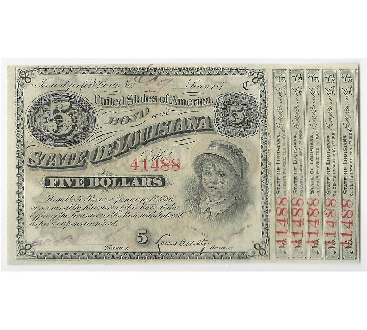 One 1875/8 $5 State of Louisiana Baby Bond Obsolete Note.
