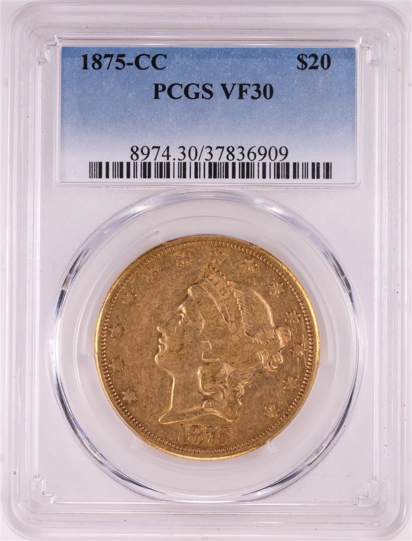 One 1875-CC $20 Liberty Head Double Eagle Gold Coin PCGS VF30. PCGS Graded.