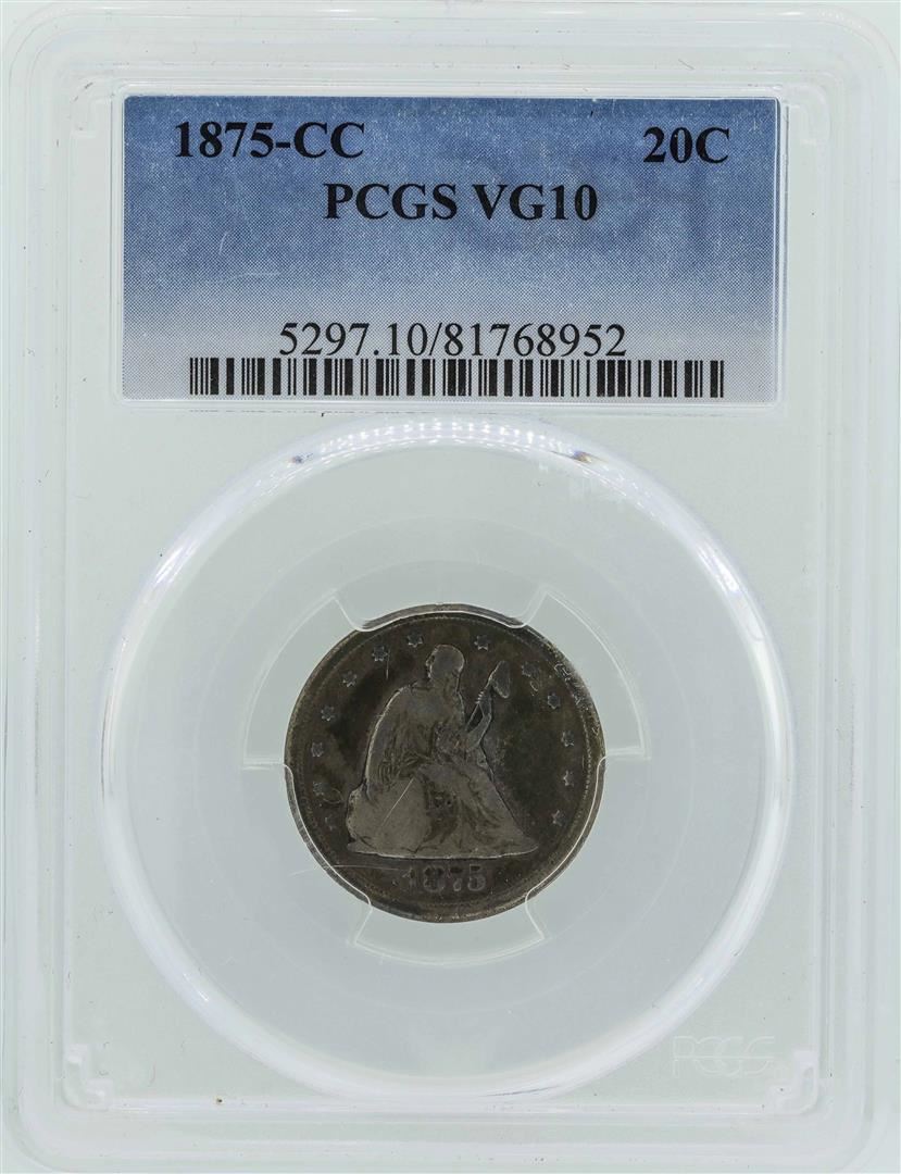 One 1875-CC Seated Liberty Twenty Cent Piece Coin PCGS VG10. PCGS Graded.