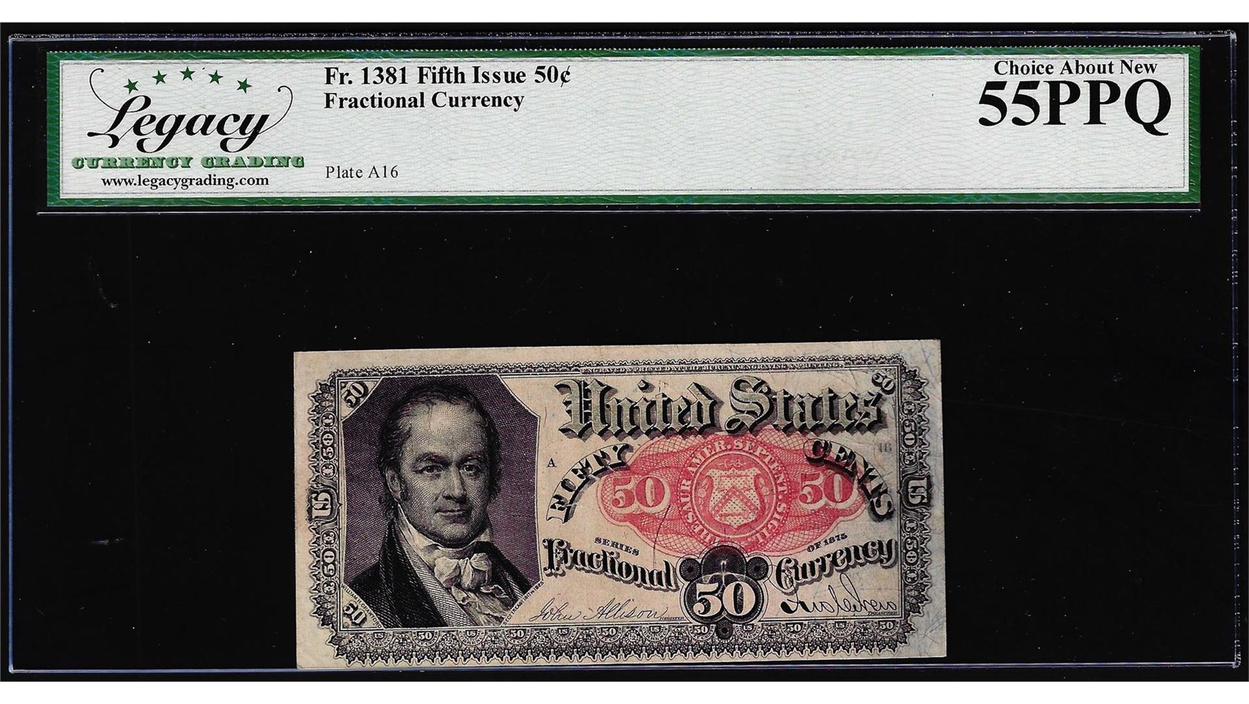 One 1875 Fifth Issue 50 Cent Fractional Currency Note Fr.1381 Legacy Choice About New 55PPQ. Legacy Graded.