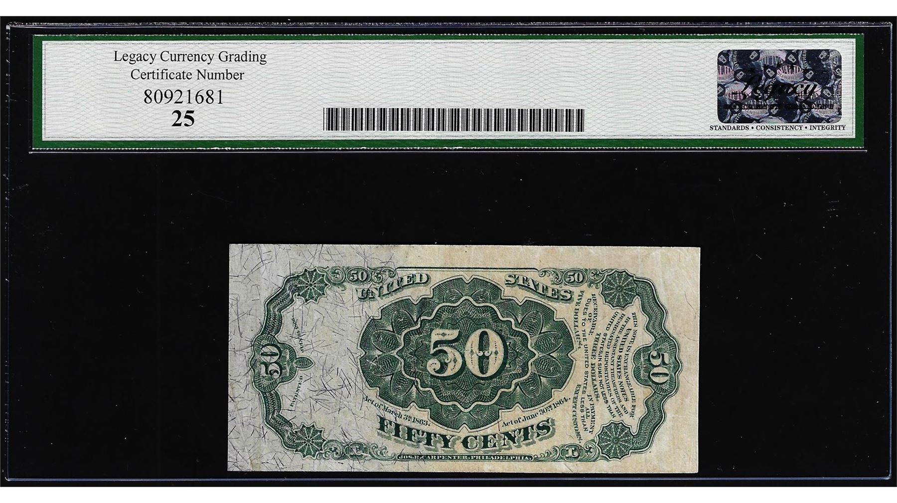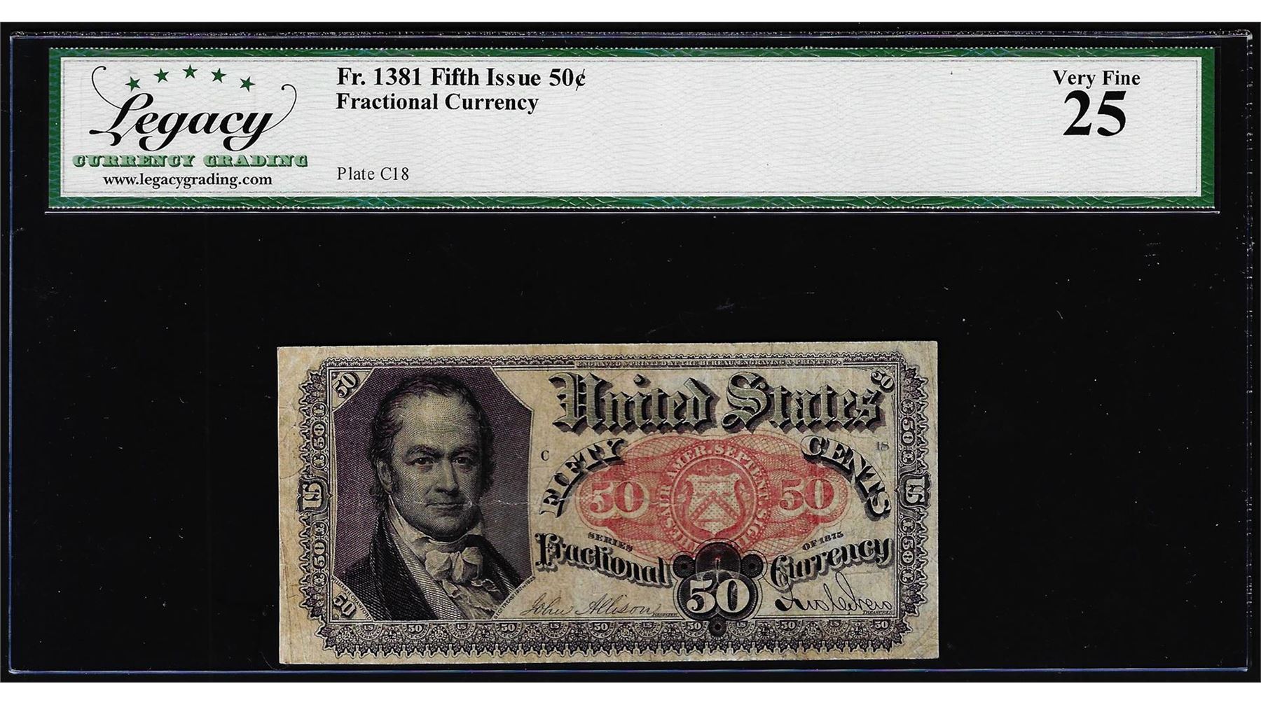 One 1875 Fifth Issue 50 Cent Fractional Currency Note Fr.1381 Legacy Very Fine 25. Legacy Graded.
