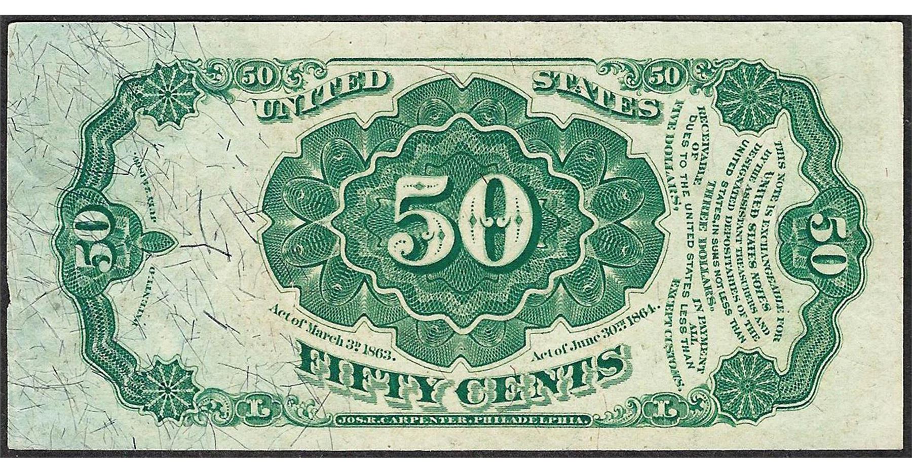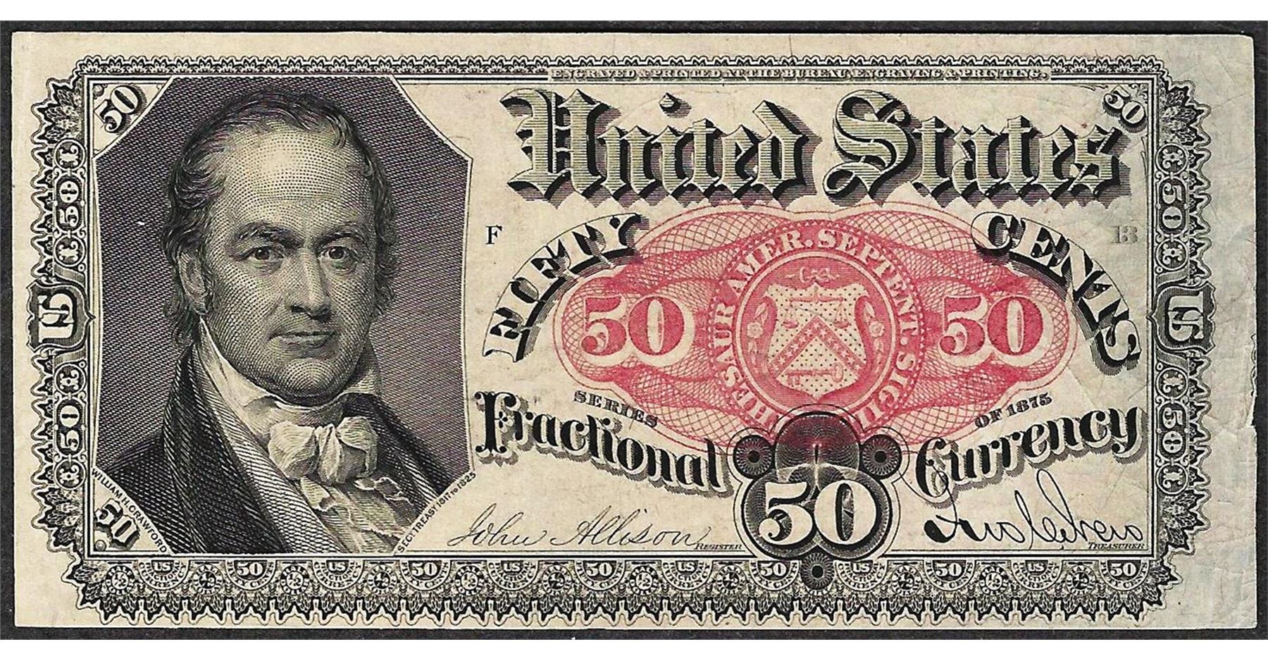 One 1875 Fifth Issue 50 Cents Fractional Currency Note.