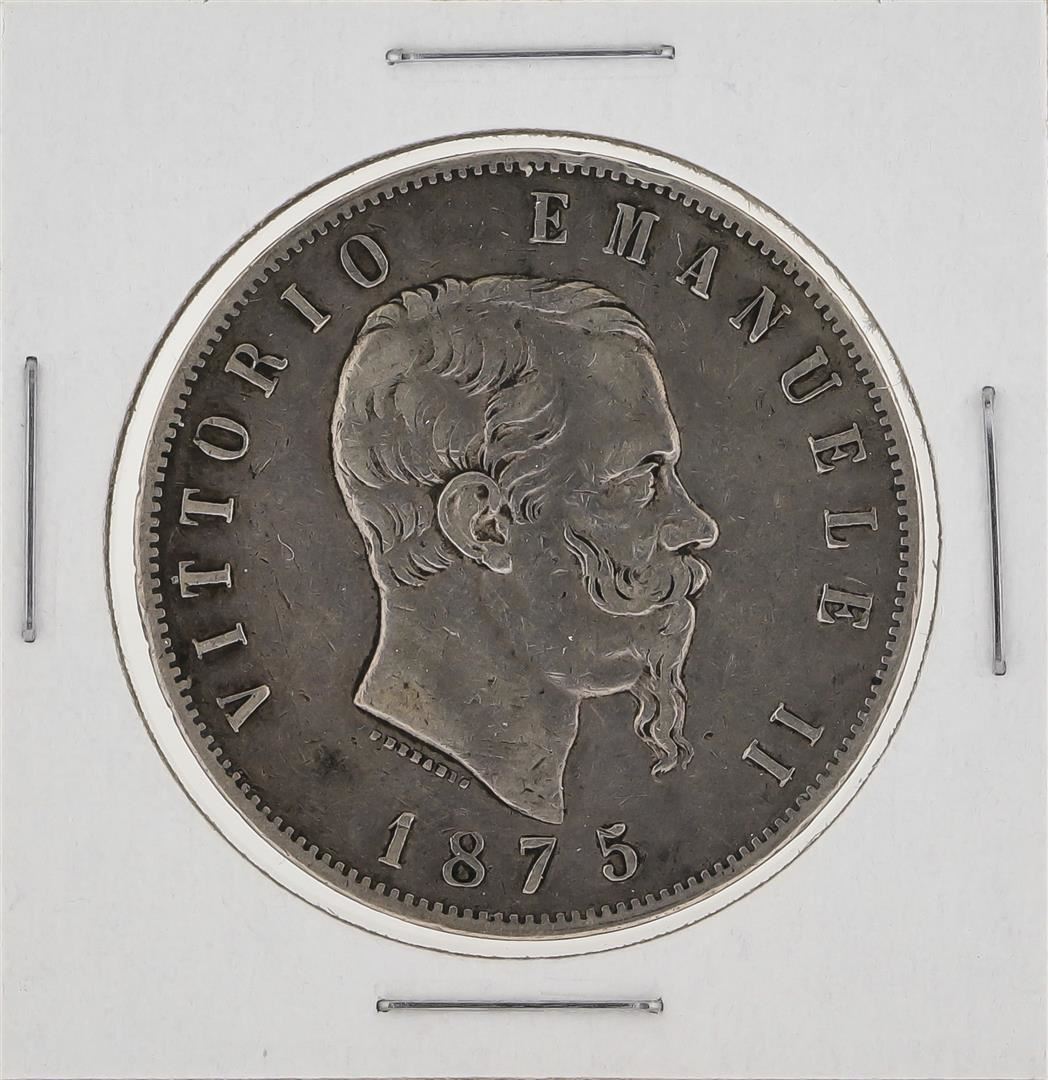 One 1875 Italy 5 Lira Silver Coin.