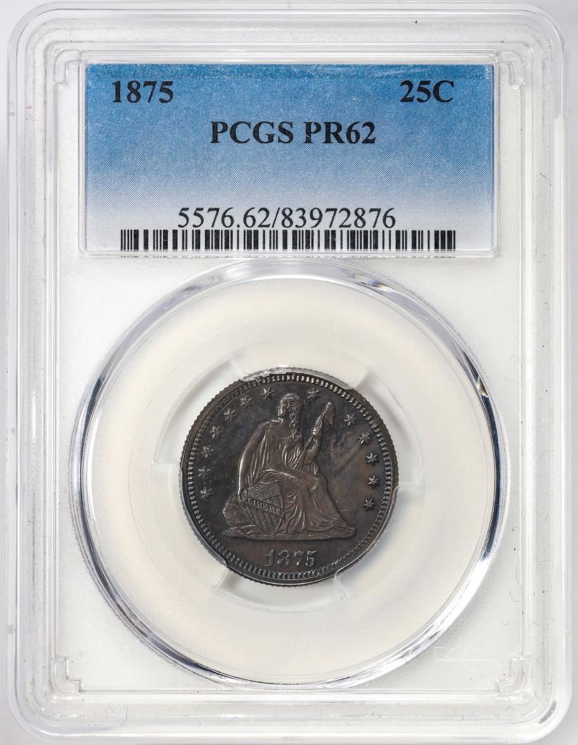 One 1875 Proof Seated Liberty Quarter Coin PCGS PR62. PCGS Graded.