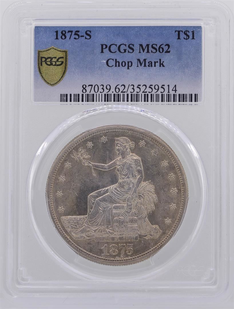 One 1875-S $1 Trade Silver Dollar Coin PCGS MS62 Chop Mark. PCGS Graded.