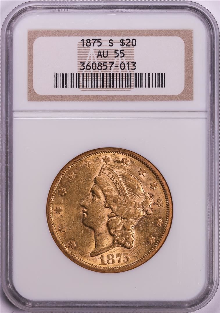 One 1875-S $20 Liberty Head Double Eagle Gold Coin NGC AU55. NGC Certified.