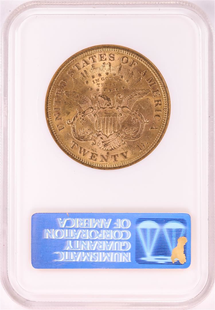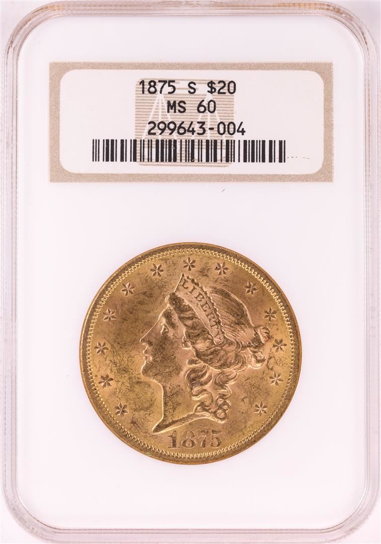 One 1875-S $20 Liberty Head Double Eagle Gold Coin NGC MS60. NGC Certified.