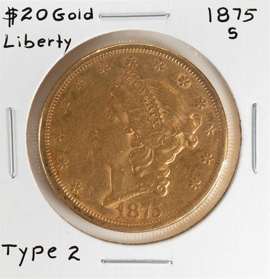 One 1875-S $20 Liberty Head Double Eagle Gold Coin.
