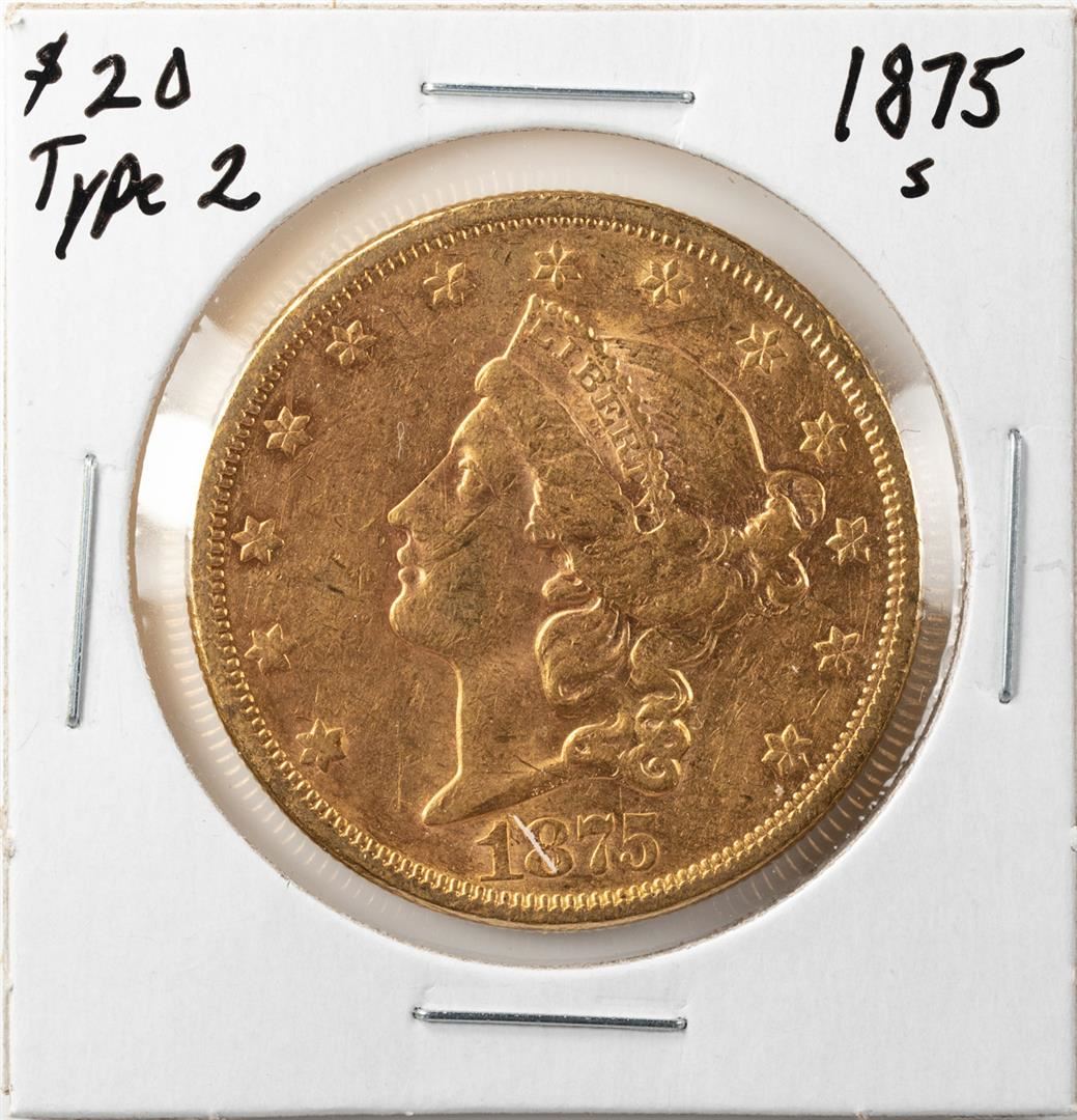 One 1875-S $20 Type 2 Liberty Head Double Eagle Gold Coin.