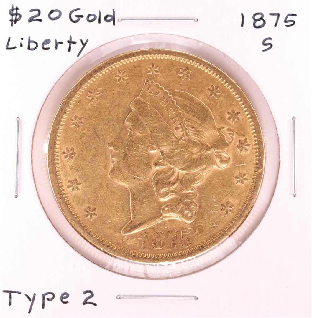 One 1875-S $20 Type 2 Liberty Head Double Eagle Gold Coin.