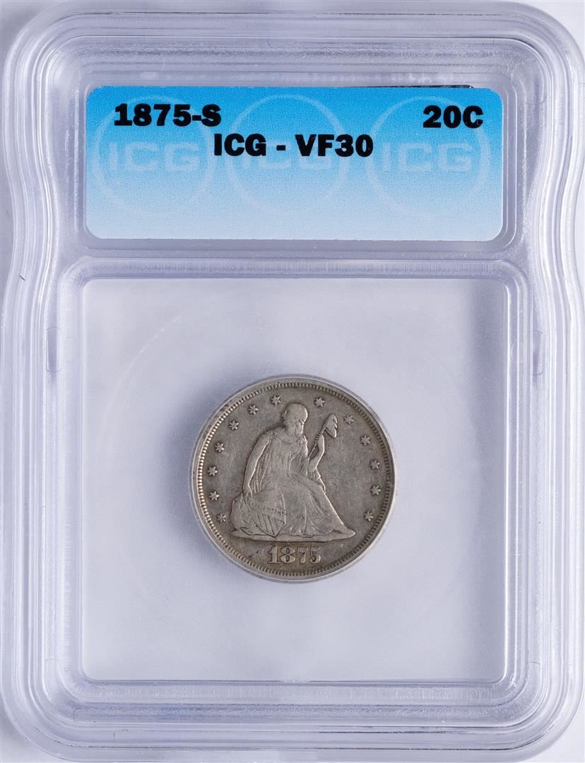 One 1875-S Twenty Cent Piece Coin ICG VF30. ICG Certified.