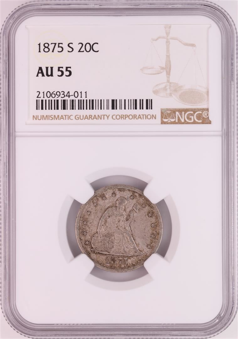 One 1875-S Twenty Cent Piece Coin NGC AU55. NGC Certified.