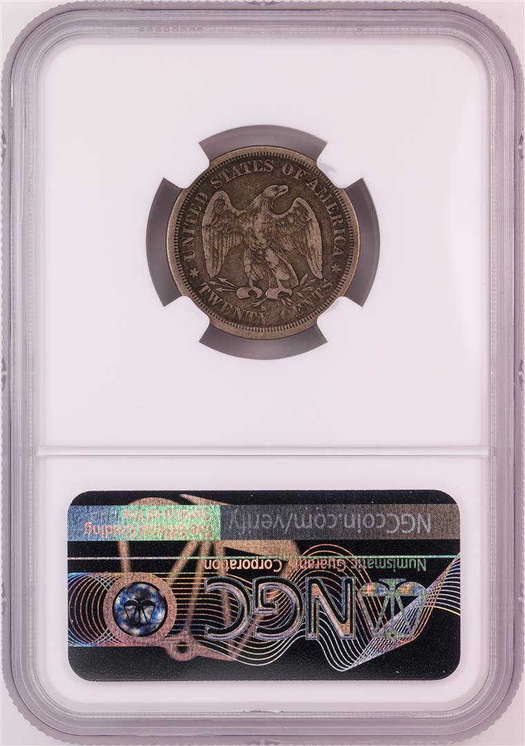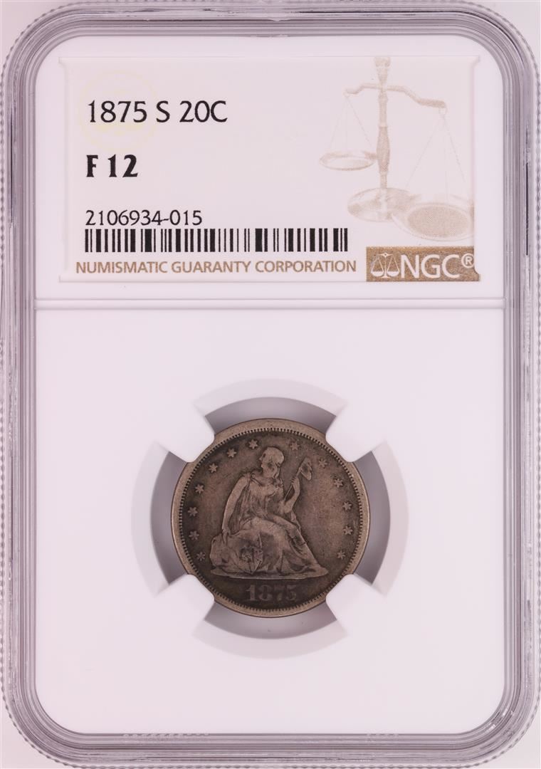 One 1875-S Twenty Cent Piece Coin NGC F12. NGC Certified.