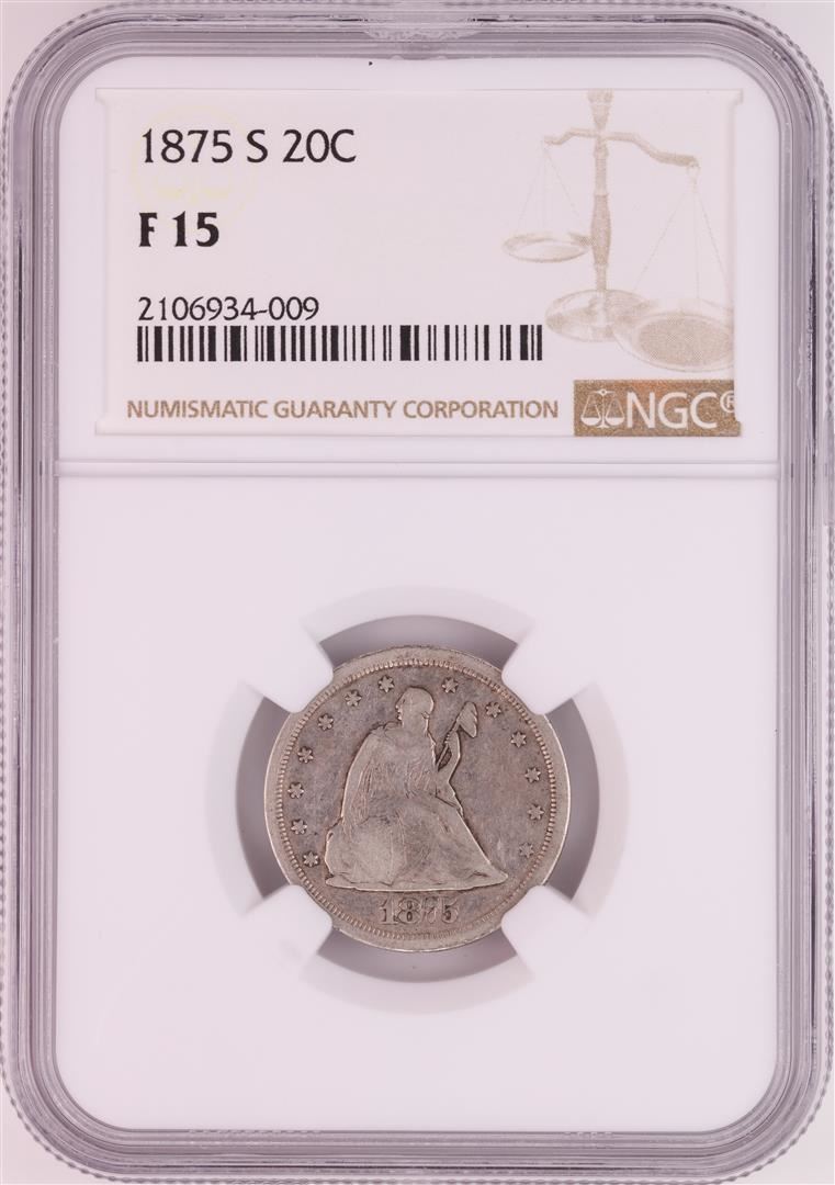 One 1875-S Twenty Cent Piece Coin NGC F15. NGC Certified.