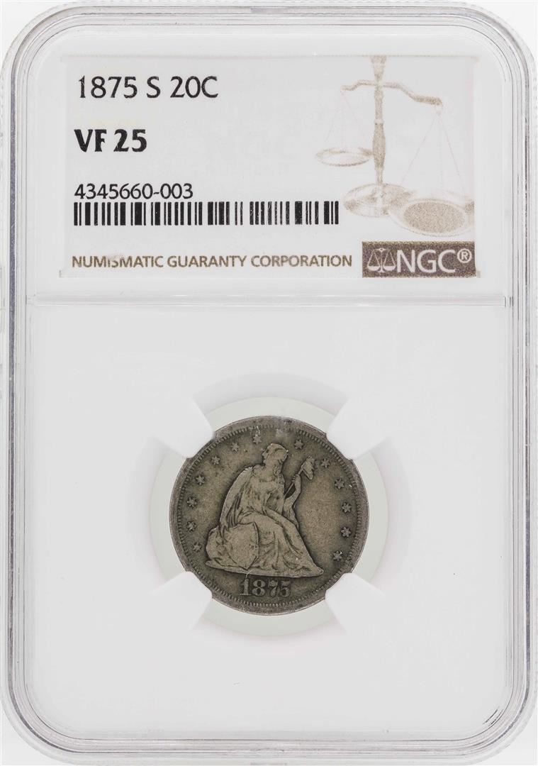 One 1875-S Twenty Cent Piece Coin NGC VF25. NGC Certified.