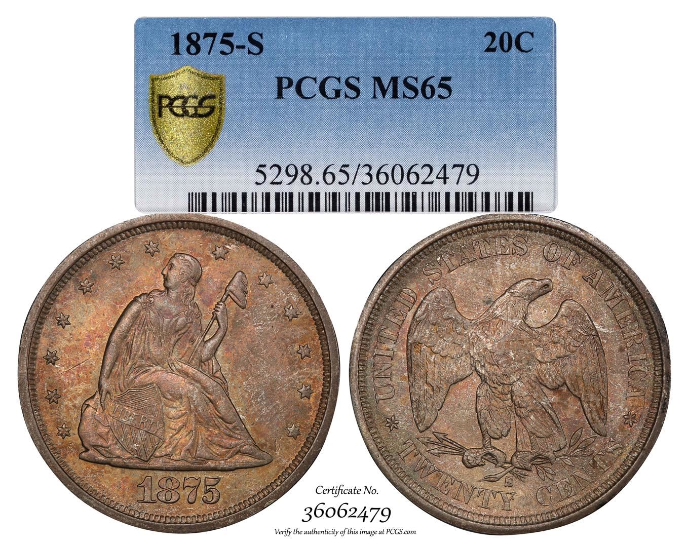One 1875-S Twenty Cent Piece Coin PCGS MS65. PCGS Graded.
