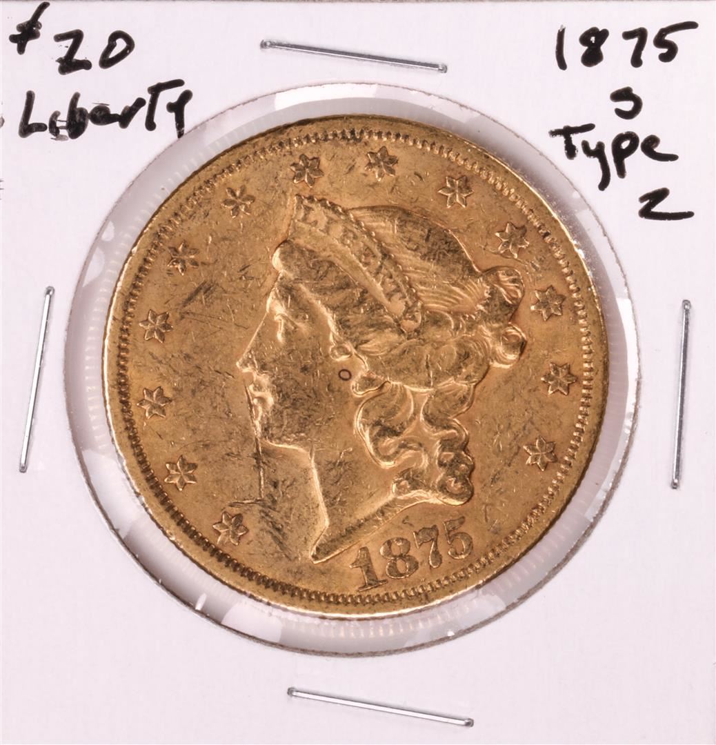 One 1875-S Type 2 $20 Liberty Head Double Eagle Gold Coin.