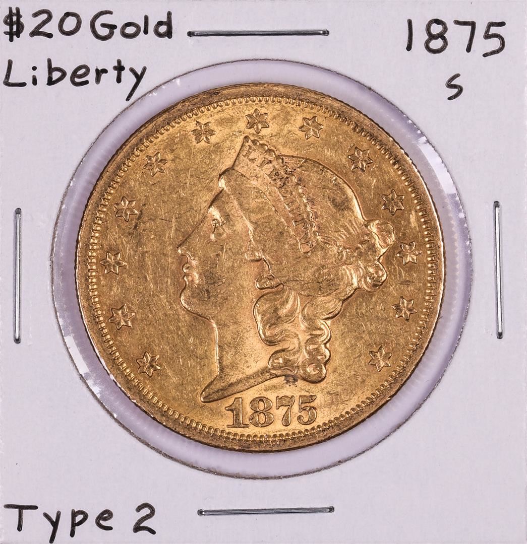 One 1875-S Type 2 $20 Liberty Head Double Eagle Gold Coin.