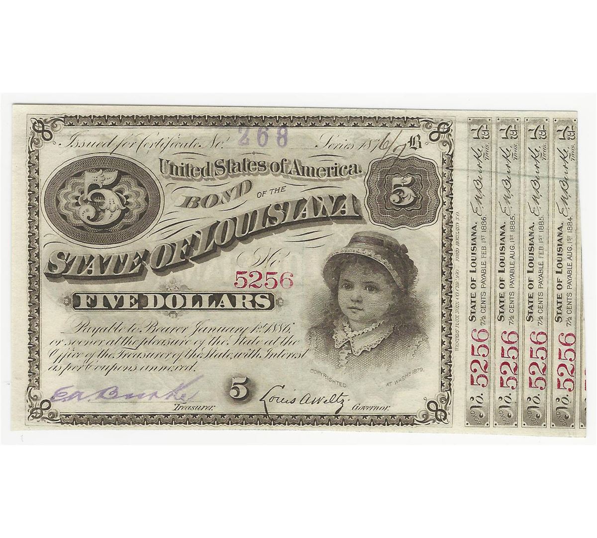 One 1876/7 $5 State of Louisiana Baby Bonds.