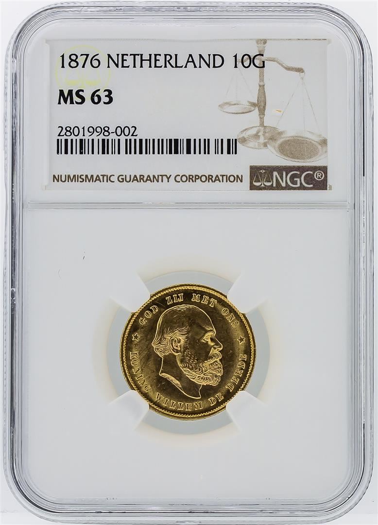 One 1876 Netherland 10 Gulden Gold Coin NGC Graded MS63. NGC Certified.
