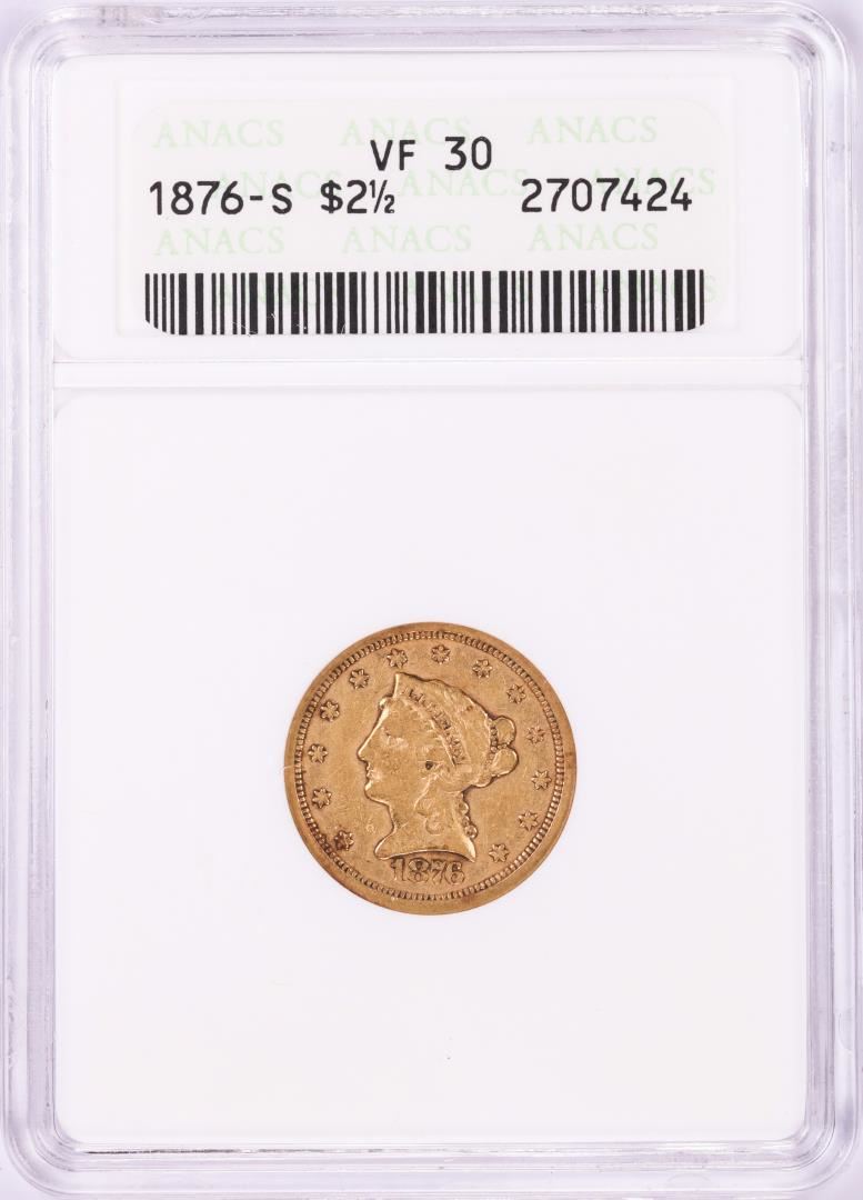 One 1876-S $2 1/2 Liberty Head Quarter Eagle Gold Coin ANACS VF30. ANACS Certified.