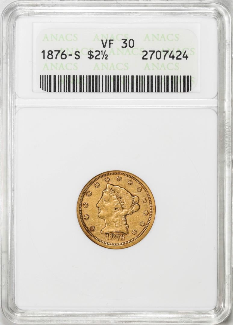 1876-S $2 1/2 Liberty Head Quarter Eagle Gold Coin ANACS VF30