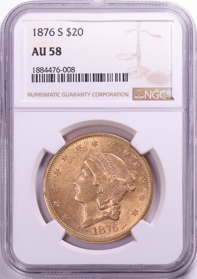One 1876-S $20 Liberty Head Double Eagle Gold Coin NGC AU58. NGC Certified.