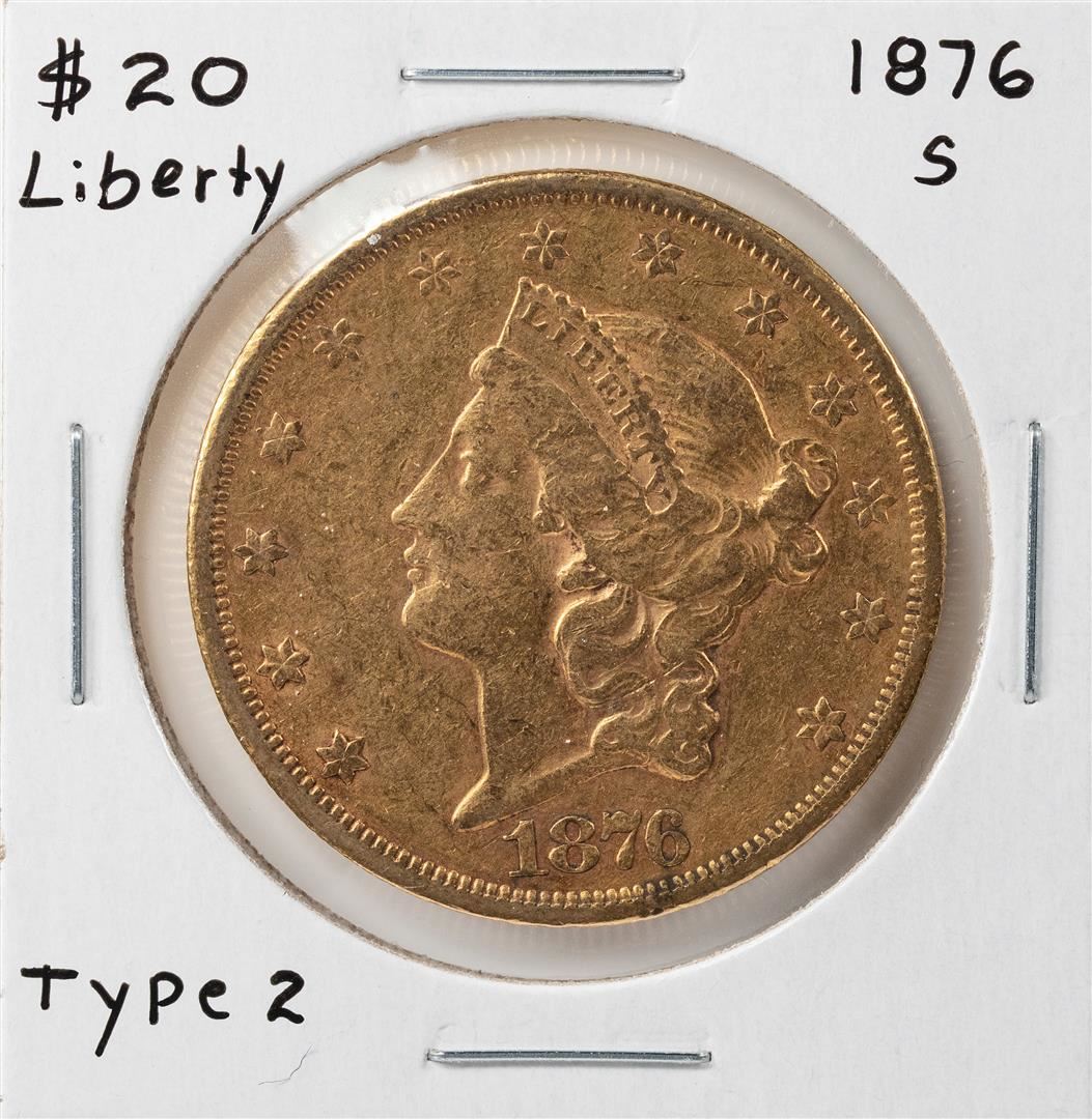 One 1876-S Liberty Head $20 Double Eagle Gold Coin.