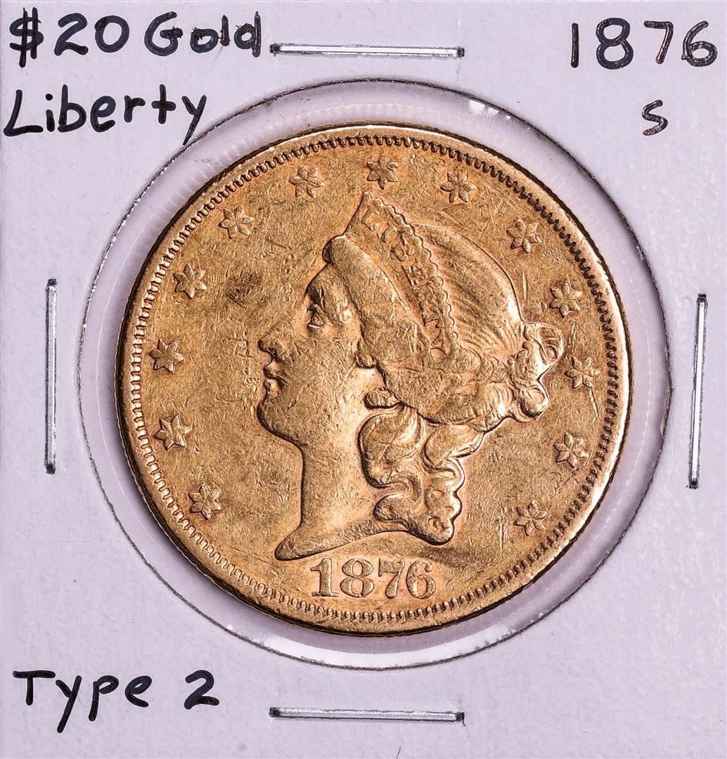 One 1876-S Type 2 $20 Liberty Head Double Eagle Gold Coin.