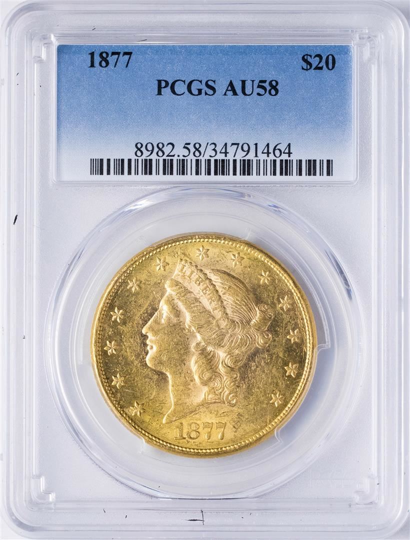 One 1877 $20 Liberty Head Double Eagle Gold Coin PCGS AU58. PCGS Graded.