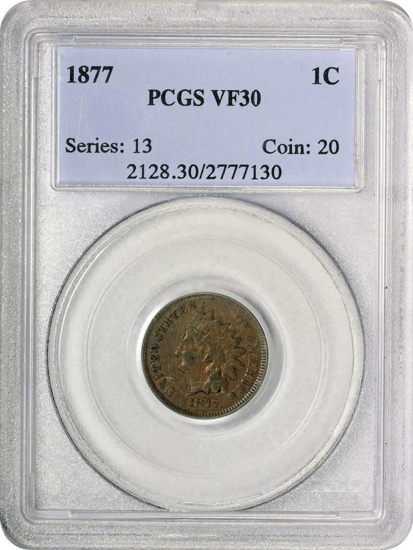 One 1877 Indian Head Cent Coin PCGS VF30. PCGS Graded.