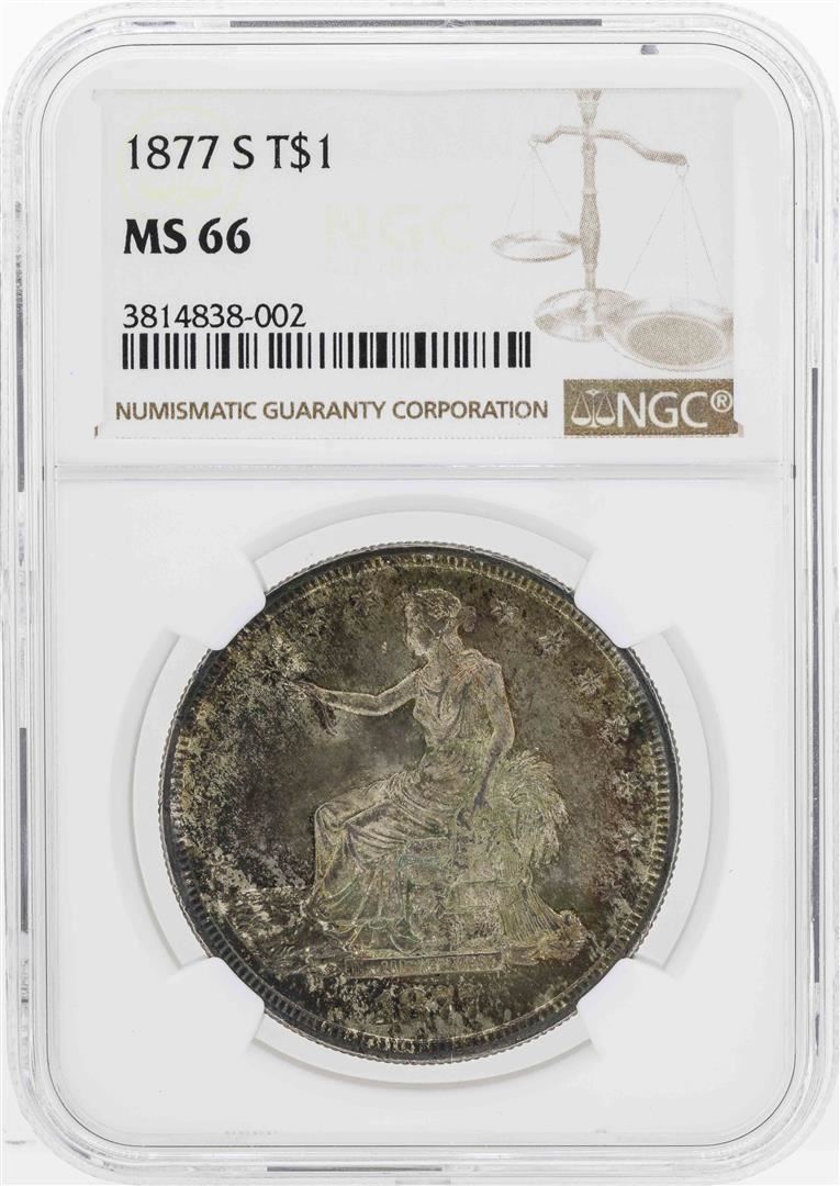 One 1877-S $1 Seated Liberty Trade Silver Dollar Coin NGC MS66. NGC Certified.