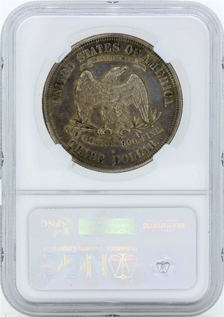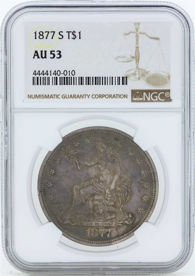 One 1877-S $1 Silver Trade Dollar Coin NGC AU53. NGC Certified.