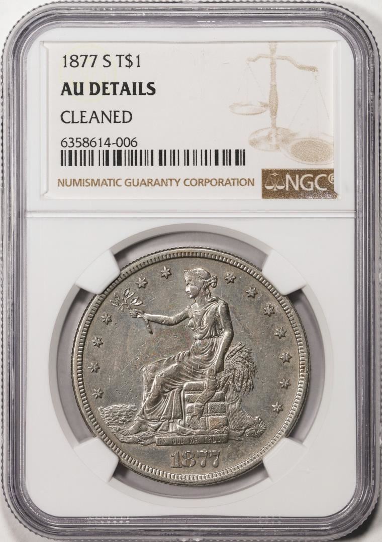 1877-S $1 Trade Silver Dollar Coin NGC AU Details Cleaned